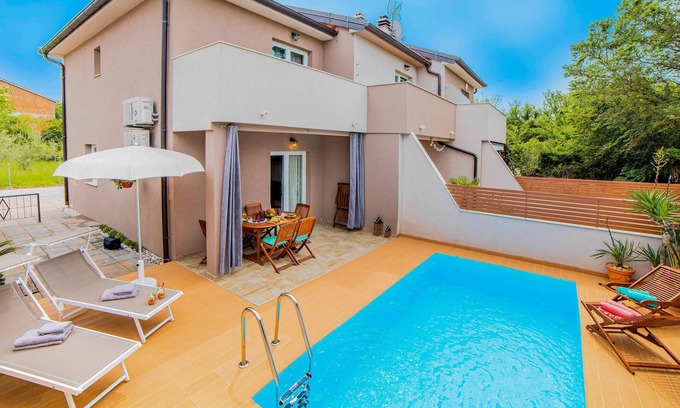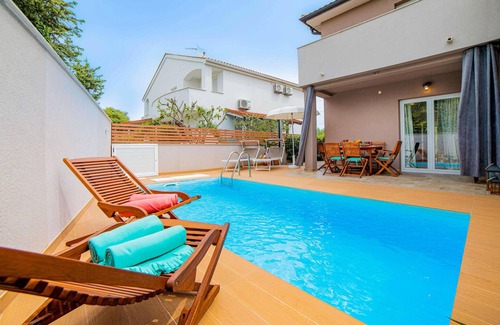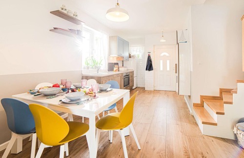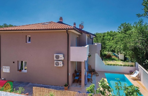 Treat yourself and your family to a feel-good vacation in this beautiful terraced house. Located in the small town of Klimno on the island of Krk, this accommodation is furnished with attention to detail and style. On the ground floor is the living area with kitchen. From the living area you can also access the covered terrace. To the bedroom and bathroom on the second floor leads you a steep staircase without railings. Refreshment can be found in the swimming pool outside. Klimno is a romantic place with the small church of St. Klement from the 14th century. Take advantage of the favorable climate in the protected bay for various water sports from May until late autumn.