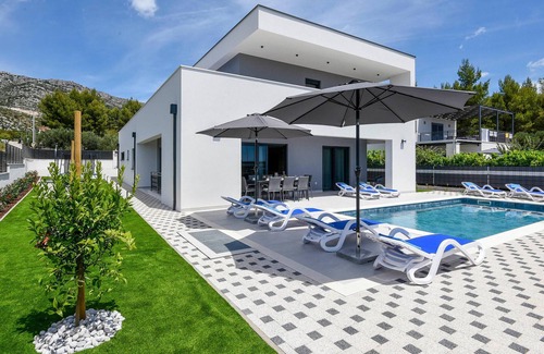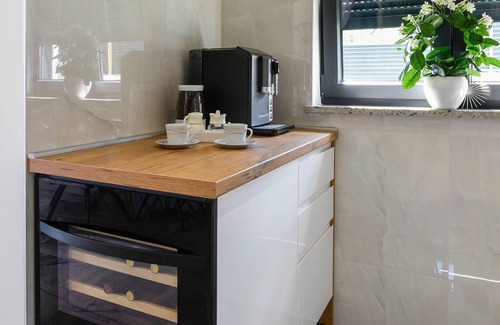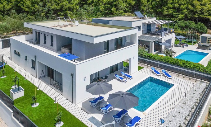 Start the day well rested and be inspired by the modern furnishings of the well-equipped kitchen to prepare a hearty breakfast for the whole family. Whether you enjoy it inside at the elegant dining table or outside on the covered terrace with barbecue is up to you. In the afternoon, the sun loungers invite you to enjoy a refreshing drink. Or enjoy the breathtaking view of the deep blue sea in the distance from the balcony. Here you will also find a soothing whirlpool. The private pool offers refreshment, where you can swim to your heart's content. The fitness room ensures that you stay in shape even on holiday, and you can relax completely in the hotel's own sauna.