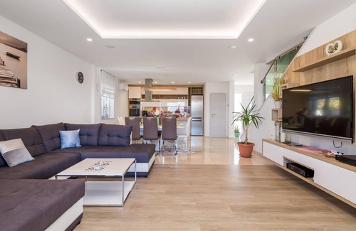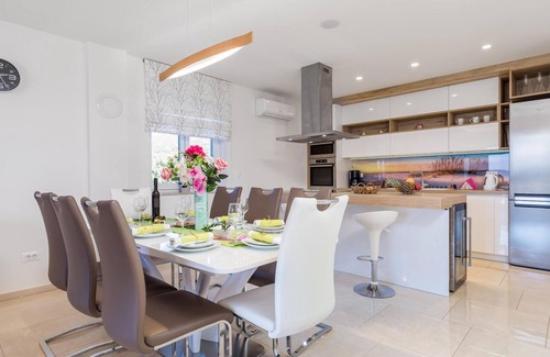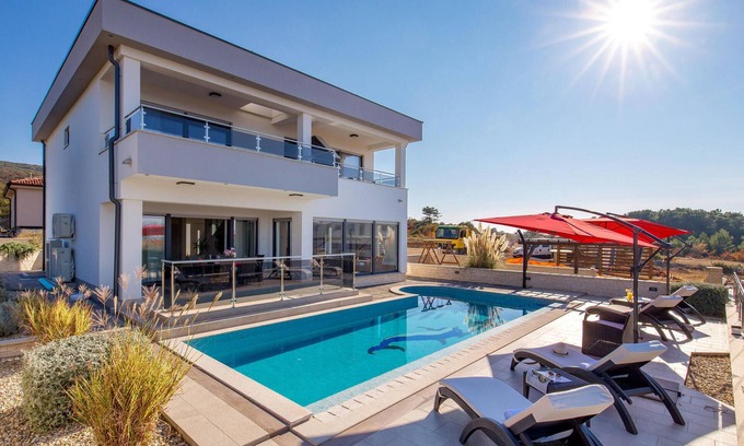 Would you like to spend your vacation in an incredible pool villa with a panoramic view of the sea? In the town of Punat on the island of Krk, this modern vacation home awaits you, perfect for those looking for a luxurious vacation. The terraces offer views of the town, the countryside and the bay. The property, next to which a road runs, is closed, so your children can play here without any worries. In front of the villa is the star of this property, the outdoor pool with sun loungers. On the first floor is the indoor jacuzzi and a sauna for your wellness pleasure. A nice barbecue awaits you on your courtyard terrace. The parking space in front of the property is reserved for you. This villa has modern heating and air conditioning systems. There is underfloor heating in all rooms, making the villa a perfect choice in all seasons. In the basement there is a small fitness room, where you can also use a table soccer. The island of Krk is connected to the mainland by a bridge and is located in the far north in Karner Bay, so it is easy to reach. In Omisalj on Krk is the international airport Rijeka. The whole island is rich in historical monuments. In the village of Baska is one of the most beautiful beaches on the northern Adriatic. In Vrbnik you should definitely taste the wine Vrbnicka Zlahtina. Visit the cave Biserujka. The nearest beaches are only a few minutes drive from your villa. There are several very good beaches in Punat. The nearby town of Krk is only a 15-minute drive away and has an interesting old town and promenade. From Valbiska you can make a trip to the island of Cres by ferry. Cres is connected in the south by a bridge with the green island of Losinj. With this villa you can only hit the bull's eye!