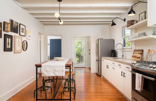 This beautifully architect-designed home is nestled in a central location a short drive from the top attractions. The home boasts antique furnishings with a contemporary urban minimalist design and plenty of amenities. Enjoy sunny days in the backyard with a grill, unwind with board games and stay connected with high-speed WiFi.