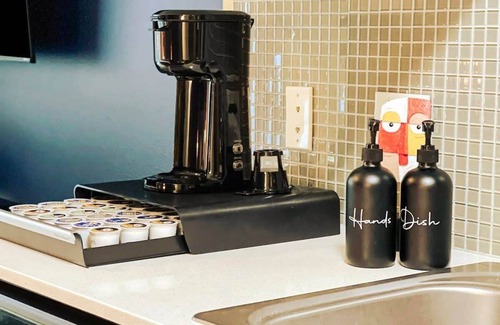 The living room is furnished with a comfortable sofa and armchair, perfect for relaxing after a day of exploring. There is also a flat-screen smart TV with FREE streaming services, allowing you to catch up on your favorite shows or movies.