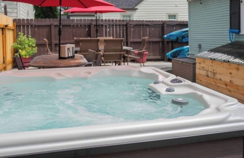 +The backyard with hot tub, beach cruisers, BBQ, 10 person tables & chairs, back parking exit & entrance, kayaks, paddle board & outdoor fun storage box.