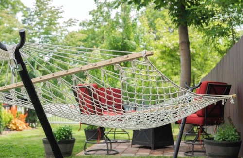 +The side yard with fire pit/comfortable chairs, hammock, repurposed greenhouse - enjoy fresh herbs!