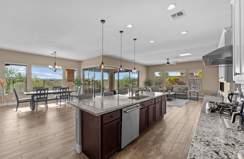 Exquisite designer home in Wickenburg Ranch! This 2,644 sq ft residence is thoughtfully crafted to offer a luxurious retreat. Enjoy a spacious kitchen featuring an oversized island, stainless steel appliances, and stylish wood-look tile flooring. The great room opens up with a multi-slide stacking door, creating an inviting indoor-outdoor flow. The large primary suite includes a walk-in closet for ample storage. A versatile den makes the perfect home office. Guests will appreciate the separate casita with its own bedroom and bathroom. Take in breathtaking sunset views and enjoy community amenities like unlimited golf at Lil’ Wick, pickleball and tennis courts, a gym, and on-site dining.
