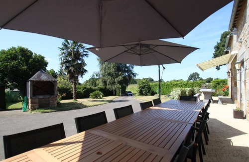 Detached house. Entrance hall with separate toilet. Equipped kitchen (oven, induction hob, dishwasher, microwave, freezer, etc.). Utility room (washing machine, dryer). Dining room. Living room (TV, fiber optic internet, DVD). Games room (table football, darts). Bedroom [hidden]x[hidden] bed). Bedroom [hidden]x[hidden] beds). Bathroom with shower. On the 1st floor: bedroom [hidden]x[hidden] bed + 90x[hidden] bed), shower room with toilet, bedroom [hidden]x[hidden] bed), bedroom [hidden]x[hidden] bed), separate toilet, shower room, bedroom [hidden]x[hidden] beds). Baby equipment on request. Oil central heating included. All charges included. Sheets and towels provided. Beds made on arrival. Cleaning service at an additional cost. Private, unfenced grounds. Terrace. Garden furniture. Barbecue. Deckchairs. Free wellness area in the annex available from 10 [hidden] to 8 [hidden] (sauna, spa). Pétanque court. Ping-pong table. Swings. Parking. With their experience hosting guests in the nearby Ille-et-Vilaine region, Justine and Gildas, the owners, have chosen this estate in the middle of the fields to offer you friendly accommodation and a green setting. The facilities are thus focused on living together and relaxation: the cozy TV lounge, multiple games, not to mention the wild games of table football! The 15 beds are well distributed, as are the bathrooms, to satisfy several families. A large green park surrounds you in absolute calm, and the old bread oven has been renovated into a wellness area. You can freely enjoy the spa and sauna in the middle of the orchard. The swings in the shade of the apple trees are a joy in the middle of summer. Located between Mont Saint-Michel and Fougères with its medieval castle, there's no shortage of activities in the surrounding area to plan your excursions.