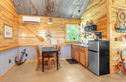 Inside, warm honey-colored wood walls, distressed corrugated metal ceilings, and quirky pail light fixtures create a unique and welcoming vibe. The Lakehouse motif is playfully woven throughout, with oars, anchors, life jackets, and fishing gear lending a nostalgic charm that feels both fun and familiar. Whether you’re dreaming of childhood summers on the dock or just craving a quiet escape, this cottage delivers the calm and comfort you need.