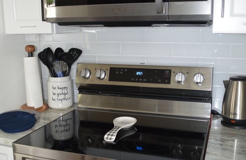 The living room has a sofa that folds into a king size bed with a 50" Smart TV and indoor fireplace. We offer Netflix to all our guests, feel free to log into your own accounts for other streaming services. The kitchen is fully stocked with kitchen tools & essentials. As a chef myself, I wanted to make sure one has the necessary tools to make anything they want to. If there is something specific you are looking for please reach out to check!