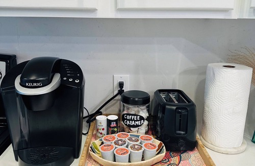 Large well-equipped central kitchen with an island, breakfast bar, and dining area. A Keurig coffee maker is also available with complimentary K-pods.