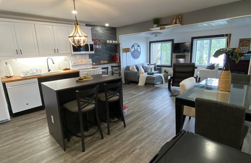 QUIET Lakefront renovated modern pet-friendly cabin for total relaxation! NOTE: We do not permit loud gatherings or loud music. This fully renovated 2-bedroom cabin is on Lac Lacroix which is a quiet lake in the hidden gem of a community of Messines. Many outdoor attractions nearby. No motorized boats allowed on the lake, so your stay is guaranteed to be zen! Relax and unwind on the fabulous deck overlooking the lake which has a canopy that can be used to cover the dining area. Excellent swimming off the dock in clear calm water with sandy bottom. Enjoy the lakeside fire pit or cozy up under the outdoor heat lamp near the sectional couch. Fish, sunbathe or kayak from the dock. Inside, the sectional overlooks the tranquil lake where the loons can be seen drifting by. Kayak and water toys are available for your use. Discover the attractions in the area! Cycling paths, hiking trails, local crafts, baked goods and more! Lots to keep the young ones entertained. Messines has invested heavily in its community centre which is a few km away. It has pickle ball, shuffle board, tennis and basketball courts available for all to use at no cost with plenty of free parking available. Parking is also free for anyone to bike along the paved bike trans Canada path. Many, many hiking trails, skidoo and cross country ski trauks are all nearby including Mont Morissette trails with a lookout tower which is a must see!