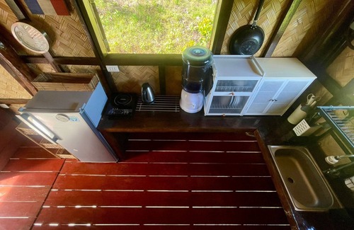 This private cabin is yours to enjoy, featuring a fully equipped kitchen where you can prepare delicious meals and savor them while being immersed in the breathtaking beauty of nature. Cooled by refreshing mountain breezes and electric fans, the cabin offers a simple, eco-friendly experience with no air conditioning, allowing you to fully embrace the natural surroundings.