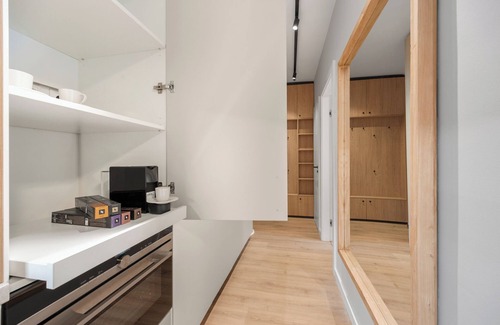 This modern 2-bedroom apartment for up to 4 guests combines design, comfort, and tranquility. It features a pleasant bedroom with a king bed, a cozy living room with a sofa bed, and a serene bathroom with a shower. Start your day with fresh coffee from the machine, unwind in the evenings with movies on the smart TV, and enjoy the relaxing atmosphere of the thoughtfully designed interior.