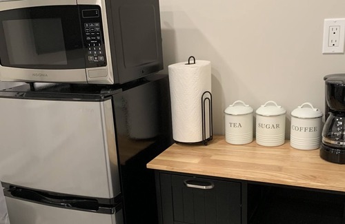 Perfect location if you are looking for a quiet getaway! Bed is a Queen Nectar mattress. Kitchenette with fridge, microwave, coffee maker, etc included. Firepit available for use. Workstation (desk & comfortable adjustable chair) located in bedroom with wifi. TV with Netflix in living room. Couch is Crate and Barrel.