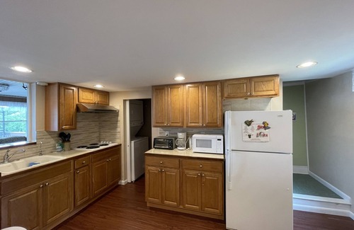 Our kitchen is stocked for all your needs including an electric cook-top, microwave, toaster, coffee maker and much more. A washing/drying machine is available for use to lessen your packing dilemmas. Gather around our gas-powered fireplace in our spacious living room to relax with Wi-Fi Internet and cable TV. Air-conditioning is also available in the entire house. We hope to make your stay feel like home. Please bring your own towels.
