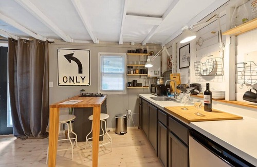 Sleep soundly on the eco-friendly queen memory foam bed (green tea + bamboo) and enjoy the convenience of a compact kitchen with sink, fridge, 2-burner hotplate, microwave, and outdoor BBQ grill.
