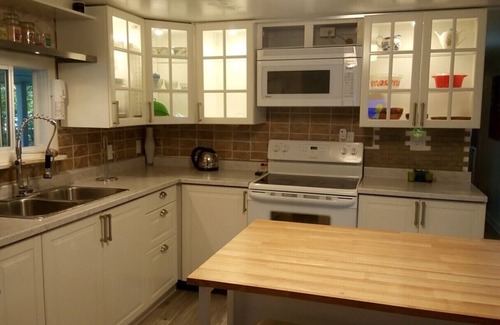 Cozy, shaded, lake front cottage on private 2 acre lot, 15 minutes from amenities. Newly renovated with 2 bedrooms, bath with tub and shower, full kitchen and washing machine. Individual climate control units in each room. Sleeps six, queen bed in master bedroom; bunk beds in 2nd room, pull-out couch in living room. Large sunny patio ; covered deck for raining days; hammocks, wood burning stove for those cool evenings. Two stand-up paddle boards, two kayaks, and a canoe, propane and charcoal BBQ.
