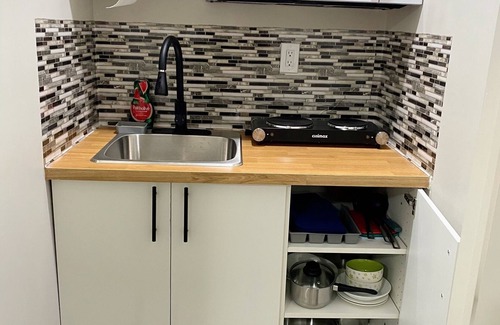 The suite features a queen-size bed, a foldable single bed for an additional guest, 2 couches, a full wardrobe, and a dedicated workstation ideal for remote work. You'll also enjoy the convenience of an ensuite bathroom, in-unit washer and dryer, and a kitchenette equipped with essentials for simple meal prep.