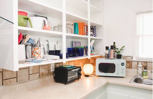 This 1000sqft gem is ready to be your home away from home. Remodeled in summer 2023, it has new paint, new furniture, mattresses, bedding and linens, etc. It's decorated with a Golden Girls theme, and you'll see artwork of Rose, Sophia, Blanche, and Dorothy in the bedrooms. This home is *quiet* with no neighbors on either side, and a park across the street.