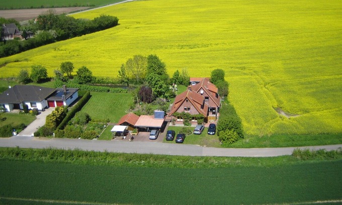 The comfortable apartment with separate entrance is located on the 1st Floor of a single-family house with a garden of over 3,300 square meters, which offers various places for relaxation. It is located on a quiet side road with little traffic that leads directly to the Baltic Sea beach. The unique all-round view to the Baltic Sea with the Danish islands and the surrounding fields gives the feeling of freedom and makes your vacation an unforgettable experience. Enjoy many happy hours on the versatile sports, play and sunbathing lawn or on one of the various resting places. From the beginning of May to approx. At the beginning of June 2019, the apartment is located on the edge of a yellow flowering, fragrant rapeseed field.