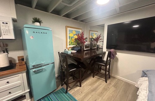 Studio apartment with attached office alcove. Full bathroom, laundry, sleeping, living and work space. Kitchenette includes induction cooktop, dishwasher, fridge, air fryer, instapot, and toaster oven.