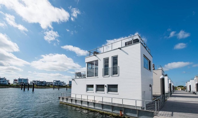 Delicious holiday meals can be prepared in the modern and well-equipped galley adjoining the living area. The sleeping area of the floating house is located below deck. The master bedroom is an experience, as guests can fall asleep and wake up in front of the water backdrop. Floor-to-ceiling windows and a terrace directly adjacent to the bedroom make it possible to walk around the house. A further bedroom with single beds that can be pushed together is also located on the lowest level of the holiday home. Flatscreen TVs in both bedrooms provide additional entertainment.