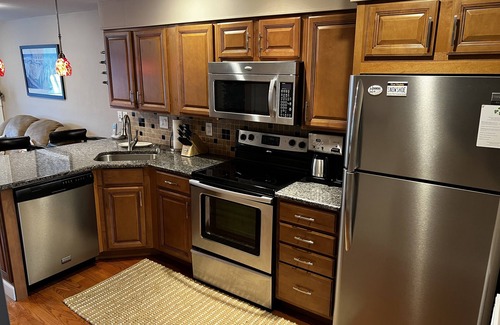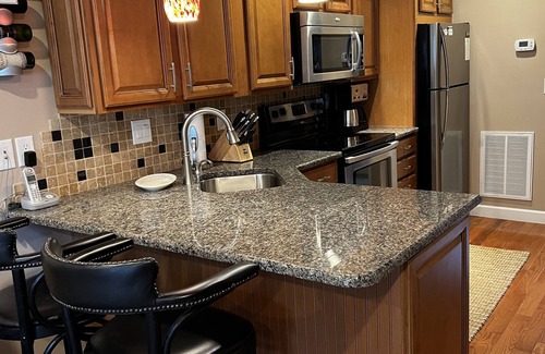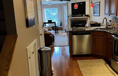 Our unit has a private entrance and private parking in front of the unit. It has been totally renovated inside and out. There is a heated mudroom that has a bench and ski storage which is a great staging room for getting ready to hit the slopes - or to remove gear at the end of your day. The fully stocked kitchen is user friendly with three barstools overlooking the stainless appliances and granite countertops. The living area includes two sofas that are extra large and extra comfortable. They recline in four separate sections and make a great place to relax and watch the large flat screen television or warm up by the wood burning fireplace. There is also a four seat table where you can share a meal or enjoy friendly game of cards while watching the snowfall.