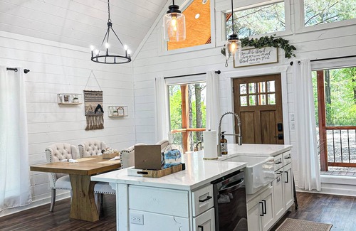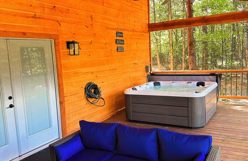 The SoHo Haven Is your Luxury Stay, perfect for two or a nice retreat for families that has overlooked no detail to provide you with rustic luxury in the farmhouse movement style. 1 BR/Sleeps 5/1 King/Fold out Couch Single/ 1 Inflatable Mattress/1 Bath. Our spacious outdoor patio is located off the master bedroom with access from the living area as well. Tall ceilings and oversized windows feature views of pines and bring the outdoors right into the cabin. This ultra romantic cabin will help you relax in Luxury! The master bedroom features a king size bed, vaulted ceilings, and you can walk straight out to a covered deck with seating and a beautiful large jacuzzi. The designer bathroom is a private oasis with a large walk-in shower and a free standing vanity tub for soaking. The deck has a large hot tub, lounge, dining, and grilling areas. We even have a wood burning fire pit perfect for smores. This stunning cabin is Non-Smoking and has 4K ultra high-definition Smart TVs with streaming services in both the master bedroom and living area, perfect for movie nights or sporting events. We are pet friendly and require a pet fee for pets.