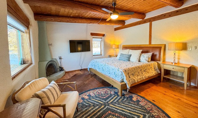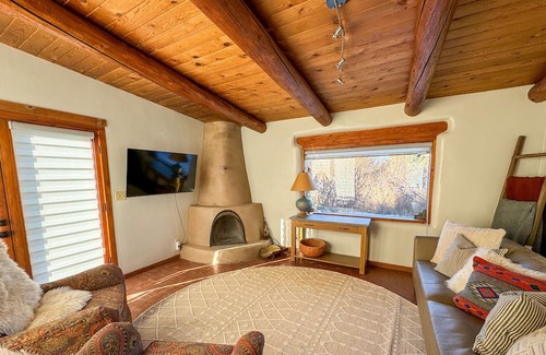 Enjoy all Taos has to offer with oodles of South West charm, mature trees and garden areas and wrap around patios at this delightful home with wonderful views. With 3 bedrooms & 2 bathrooms, there's plenty of space for the whole family including our fury friends. Close to beautiful walking trails, very convenient to the hospital and short drive to the downtown plaza area. Lots of South West charm with Kiva fireplaces and Vigas throughout the home. Primary bedroom has Kiva fireplace, cozy sitting area and great views through a picture window of Taos Mountain. King bed, smart TV and ensuite bathroom with walk in shower. Second bedroom is a King bed. Please note that the third bedroom is a queen bed and does not have a door, is open to the dining area, it has a privacy wall. Lots of great outdoor space with concrete patios and garden areas. Please note that if you're bringing your fury friends, the property is not fully fenced and local laws require dogs to be on leashes when out and about.