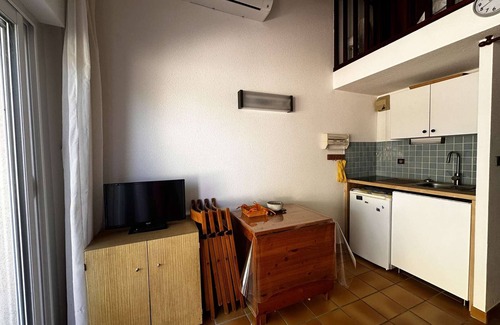 This vacation apartment features a living room with a television (subject to good reception), a kitchen area opening onto a terrace, a sleeping area with a bunk bed (2x90), a mezzanine with a double bed (140*), and a bathroom with toilet.