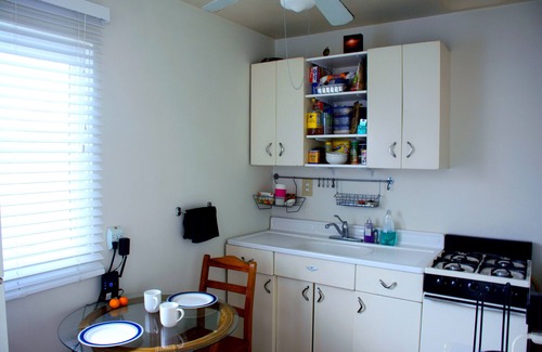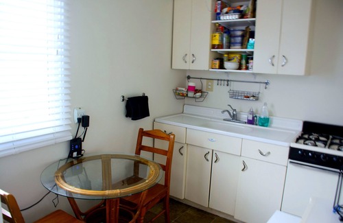 The studio has vinyl floors throughout. Full kitchen with everything you need: Pots, Pans, Plates, Utensils, Glasses, Cups, Coffee Maker, Stove & Oven and Full Sized Refrigerator. Relax seated on the patio reading a book or playing a guitar taking in the luke warm and breezy air.