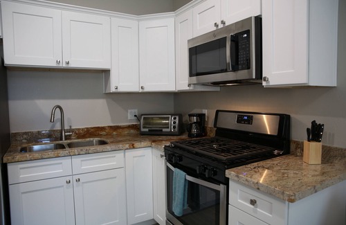 Fun kitchen, stocked with basics, for extended stays. Free street parking. Guest house has private outdoor sitting area with fire pit, and a common area with pergola and grill.