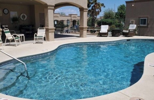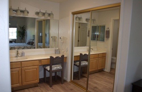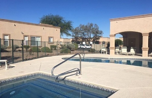 Studio room in age restricted community (55 and older). Enjoy a cozy space with king size bed, sink, mini fridge, Keurig coffee maker, microwave, toaster oven, small panini griddle, table with chairs, television, local cable as well as tv apps, hi speed wifi, and full bathroom with large vanity. This unit also has the heated pool, hot tub, and sauna directly across the street and is right up the street from Coyote Grill on San Ignacio golf course.