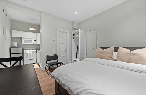 Entire Bachelor Apartment: Enjoy complete privacy with a cozy queen bed, open space, and modern amenities such as, in-building laundry, free on-site parking, and a full kitchen.