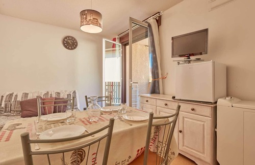 Bright living area with sofa bed, TV, dining space (table, 4 chairs), and equipped kitchen (electric cooktop, microwave, mini oven, fridge, washing machine).