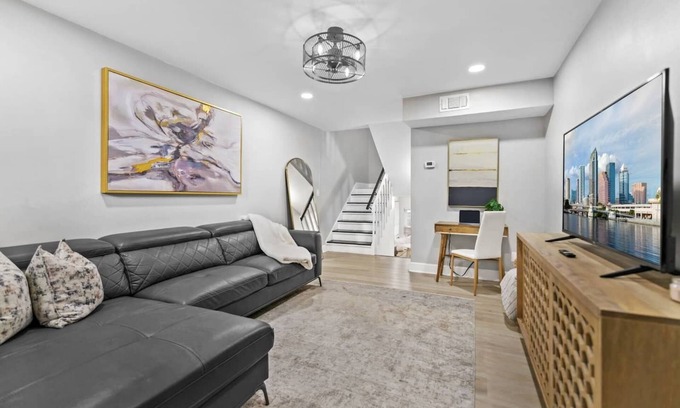 The living room is on the first floor and is the best place in the house to kick and relax back after a fun day exploring Tampa! There is a large sectional sofa to relax on that can also double as a bed if more sleeping space is needed. The flat-screen TV is a Smart TV so feel free to stream any of your favorite shows or movies!