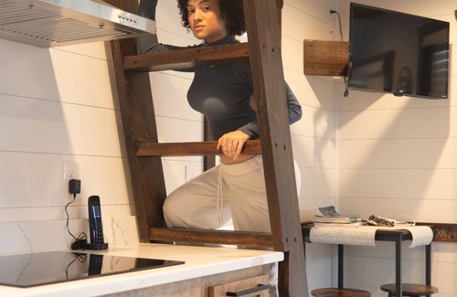 The master bedroom features a comfortable king-sized bed and a private outdoor balcony. The loft, accessible via a ladder, is a favorite among kids and adventurous adults, providing two twin beds, smart TV, separate heating and cooling settings, and outlets for charging.
