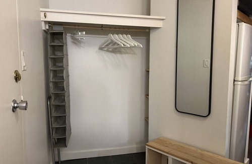 Studio suite with a Murphy Queen Bed that doubles as a couch when the bed is up.