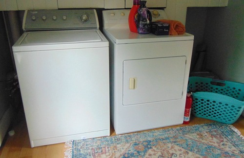 The cottage has a spacious deck and yard which backs up to woods. Downstairs is an open plan sitting, dinning room and kitchen as well as a small separate laundry room containing a washer and dryer. There are 2 bedrooms one with a King bed the other a Queen, there is also a small room adjoining the main bedroom which is equipped with a Twin bed.