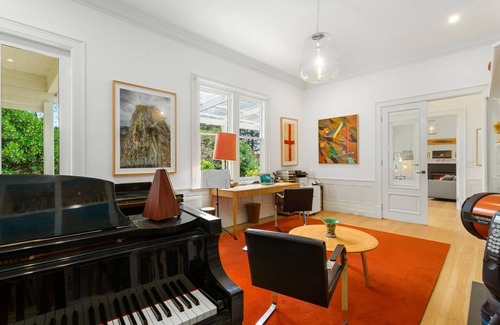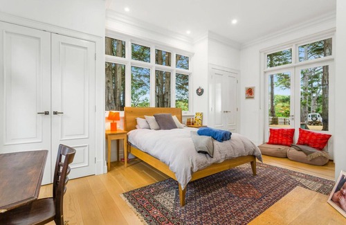 With soaring ceilings and majestic proportions, Craig Avon boasts 4 bedrooms, a library/music room with boudoir grand piano, 3 living areas, a farmhouse kitchen, 2 bathrooms, oak floors throughout, a glasshouse studio, and extensive decks all around. The outdoor decks areas include 2 table settings, a built in bath under the trees, and many lounging possibilities.
