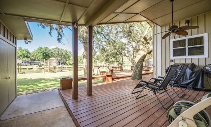 This reelaxing retreat is nestled in the giant oak trees of Caney Creek. The home comes with a fishing pier, fishing lights, boat lift, fish cleaning station, bait well all for our guest's enjoyment! Relax on the peaceful patio, overlooking the water.. or on the top deck of the boat house! Or head on over to Sargent Beach with just a quick car or boat ride.