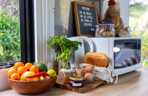 Discover the tranquility of the rural Creekside at Kuaotunu, where the simple pleasures of nature await at our tiny house retreat. Embrace the serenity surrounded by lush bush, fruitful trees, and a gentle creek to dip your toes into. Escape from it all and find peace, yet still have all the comforts and delights at your doorstep, creating a perfect balance between seclusion and convenience.