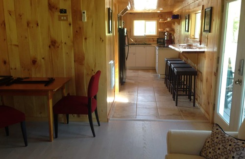 Designed for a family or a group of friends wanting to hang out of the weekend. There are 4 twin beds on the dormitory second level ( 2 can be pushed together and made up as a king just let us know ahead of time) and a queen-sized pull-out couch in the living room. It is also perfect for a groom's party.