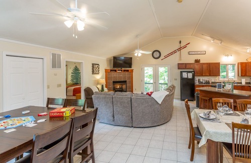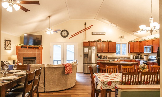 With 2 living areas complete with flat-screen Tvs with Chromecast and fireplace, Creekside offers endless comfortable places to unwind after spending a day on the ski slopes or on the hiking trails. While the sports fans of the group watch the James Madison game upstairs, gather around the game table and get your competitive juices flowing. As you play Settlers of Catan, you'll be steps away from the kitchen complete with a large island. The fully stocked kitchen with plenteous pots, pans, silverware, and more is on the upper level of the home open to living and dining areas providing a wonderful area for entertaining and gathering.