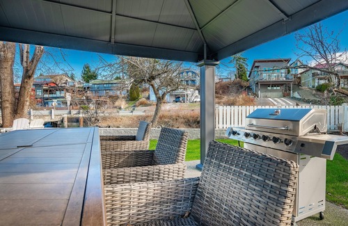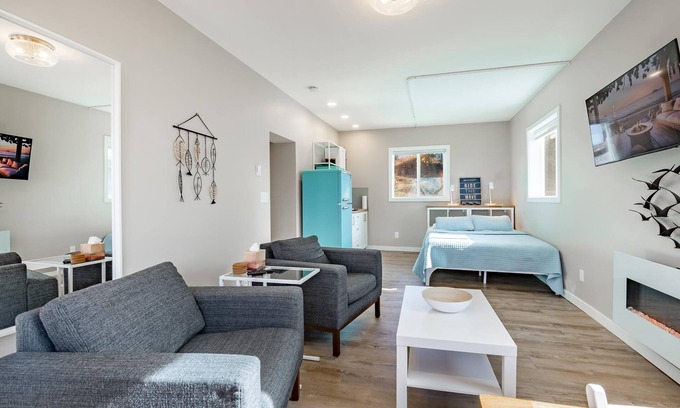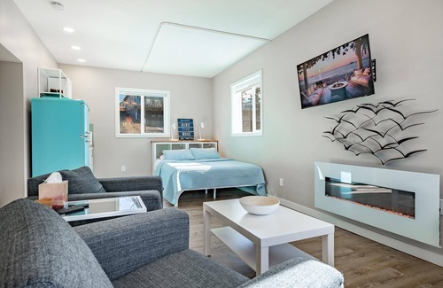 Modern coastal studio, renovated in 2023, features cozy electric fireplace and cute kitchenette. Kitchenette has full fridge, breakfast center microwave and kettle. See the ocean from your built-in window seat or dining table on the adjacent patio space. BBQ, fire pit, clamming station, covered outdoor dining…. Close to Birch Bay amenities, across from beach access, quiet and private. Relax in this exclusive, 5-unit seaside community. Ideal for business / pleasure. Community accommodates 20.