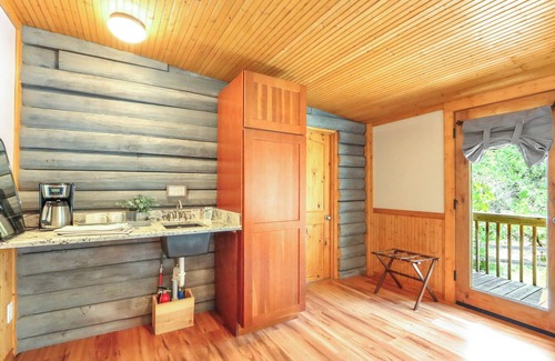 For even more space, the attached cabin (with its own entrance or interior access) offers a private king bedroom and a bathroom with a charming clawfoot tub. The cabin also features a cozy living room with a full futon, a full kitchen, and an outdoor deck with stunning creek views.