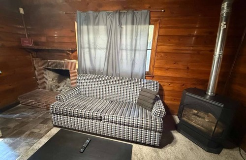A cozy home with one bedroom, a small bathroom, a living area, and a compact kitchen. The bedroom is a comfy spot to rest, and the bathroom is simple but functional. The living area connects everything, making it easy to move around. The little kitchen is equipped for basic cooking needs, In this snug Crestline abode, simplicity meets comfort, creating a welcoming space in the midst of nature's beauty.