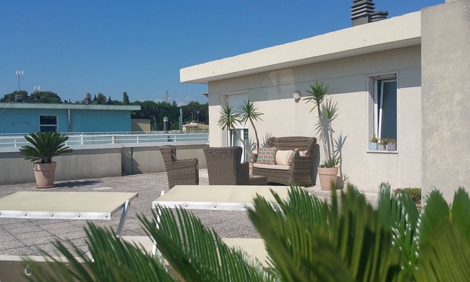 Bright penthouse a few steps from the sea, in a residential area, with a large bedroom with a double bed and the possibility of a comfortable sofa bed for a third person or a baby bed, with Smart TV and Netflix, bathroom with shower, kitchen equipped, washing machine, elegant sitting room with TV on the veranda, wi-fi.
