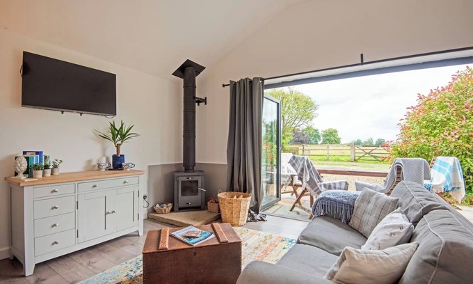 Book your stay at this charming countryside retreat, nestled in the heart of nature. Located conveniently close to Manchester airport, it offers a private and rural escape. Guests can enjoy the serene surroundings and explore three of Cheshire's finest country pubs within walking distance. With a seamless indoor-outdoor living space for the summer and a cozy wood-burning stove for the winter, the accommodation provides the perfect setting for a relaxing getaway.