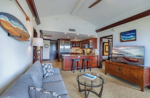 Experience ultimate relaxation in this tranquil, top-floor penthouse suite at Kauai's Waipouli Beach Resort & Spa. This luxurious ocean-view haven boasts two King Size Master bedrooms, each with its own lavish 3/4 Master bath adorned with elegant Indonesian woods and sleek Peruvian tile. The master baths feature custom marble and tile surrounds, double sinks, oversized soaking tubs, and walk-in showers. Drift off into restful slumber on a king-size canopy four-poster bed with sumptuous linens and down-filled duvets.