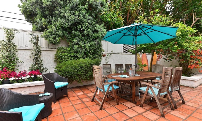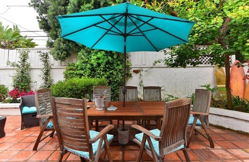 Family Room: Large family room with open beam ceiling and wood burning fire place. Large leather European Style Queen size sleeper sofa. Family room opens up to a sun drenched patio with 4 burner Viking Grill and outdoor dining.
