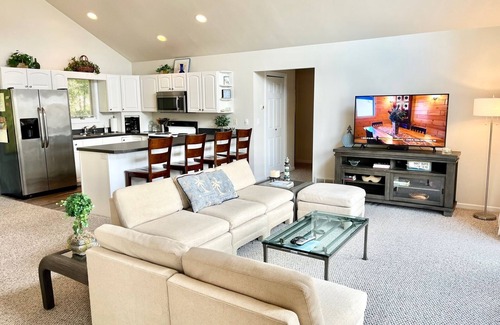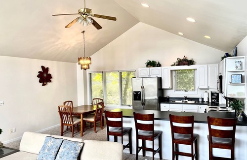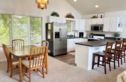 This cute cottage is right across the street from beautiful Crystal Lake where you have a beach with lake access. If you have a boat, no problem, we have a mooring buoy that holds a boat up to 30 feet in length. A public boat launch is conveniently located adjacent to the property! The open floor plan is great for family fun or entertaining. Cable TV can be found in the living room as well as in the Master Bedroom. Wi-Fi is available for your personal devices. Bright and Airy best describes the feel of the decor. The spacious Living Room has an L shaped couch with plenty of seating, expansive glass sliding doors that open to a balcony that overlooks Crystal Lake. The kitchen is fully equipped with dishes, glass ware, pots and pans, cooking utensils, coffee maker, toaster, microwave, and dishwasher. Both bedrooms have their own bathroom. The 1st bedroom features a King Size Bed, large closet, flat screen TV, and an adjoining full bathroom. The second bedroom has bunk beds and a large closet. The lower bunk bed is a full size bed, and the upper bed is a single. Located on the South Shore of Crystal Lake, just a 5 minute drive to Frankfort, which has small town charm with boutique shopping, and great restaurants. Frankfort also offers a public beach on Lake Michigan next to the pier. Sleeping Bear Sand Dunes National Park, Point Betsie Lighthouse, and several spectacular golf courses are nearby.